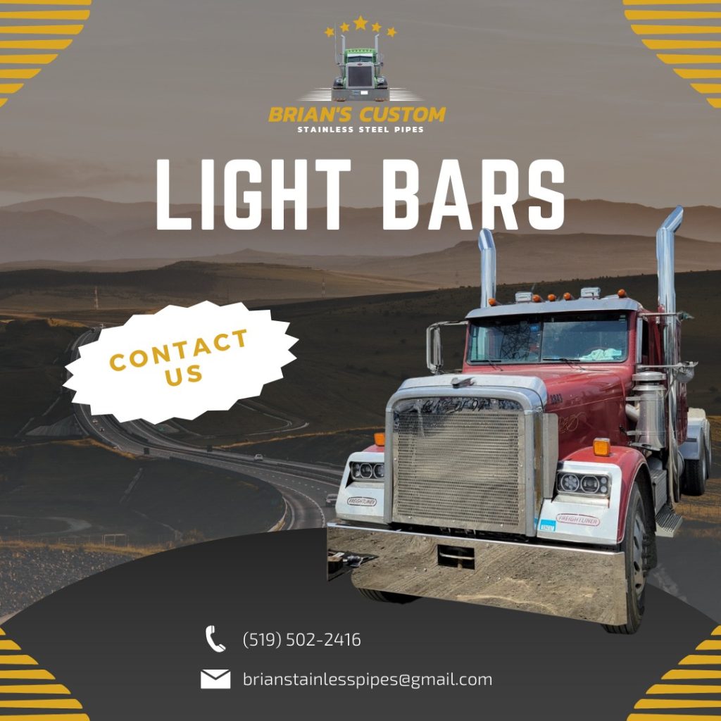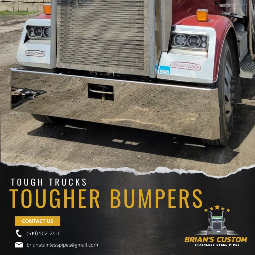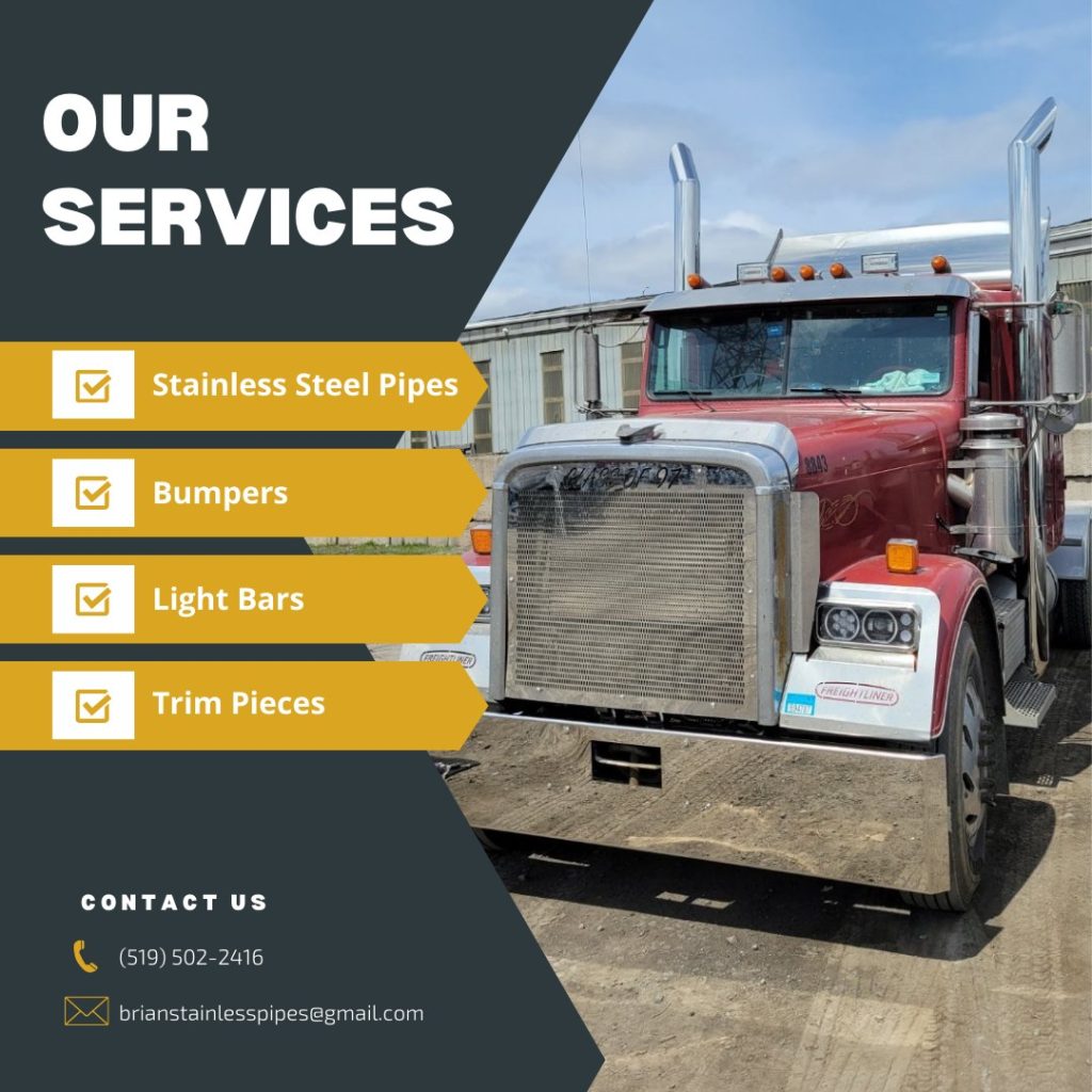 Brian’s Custom Stainless Steel Pipes: Your One-Stop Shop! From stainless steel pipes and bumpers to light bars and trim pieces, we’ve got you covered! Experience top-notch craftsmanship and exceptional service, all in one place. Discover the ultimate trucking upgrades today!