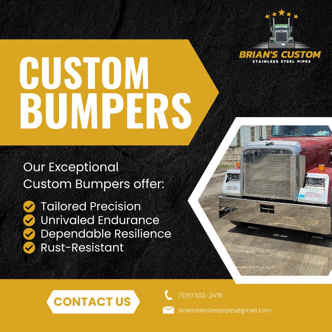 Brian’s Custom Stainless Steel Pipes: Your One-Stop Shop! From stainless steel pipes and bumpers to light bars and trim pieces, we’ve got you covered! Experience top-notch craftsmanship and exceptional service, all in one place. Discover the ultimate trucking upgrades today!